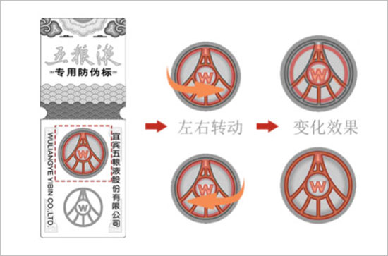 防伪标下部五粮液厂徽为360度全方位立体浮雕,可随观看角度不同LOGO逐渐改变外观大小。