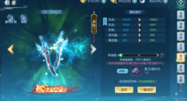 影刀需要消耗影刀进阶石来进阶,满阶后拥有独特的外观之外还有非凡的杀伤力,仙途必备,但同样需要耗费大量的影刀进阶石拉进行培养。影刀进阶石可以通过商城购买、影刀副本以及特殊活动获得