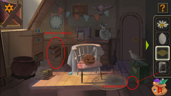 查看正前方桌面上的沙漏并在鸽子下方捡起一瓶猫头鹰饲料,在椅子下有一盒火柴也捡起来。