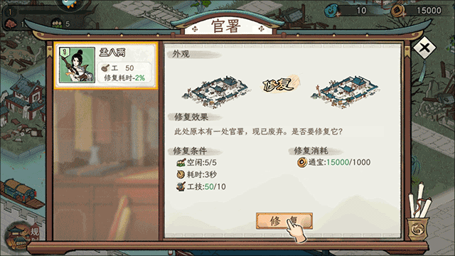 归息--升级经营建筑时,劳动力减少,且获得玩家经验增加。