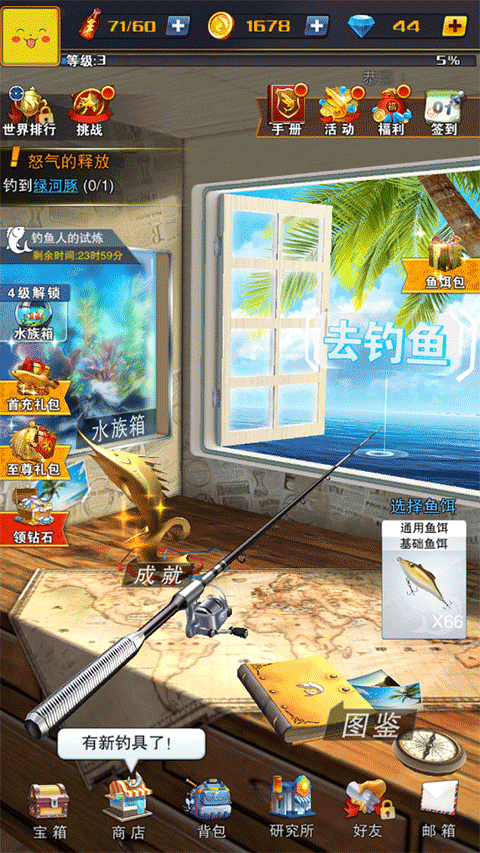 1、进到游戏会获得最基础的渔具和钓饵到钓场开始操作;