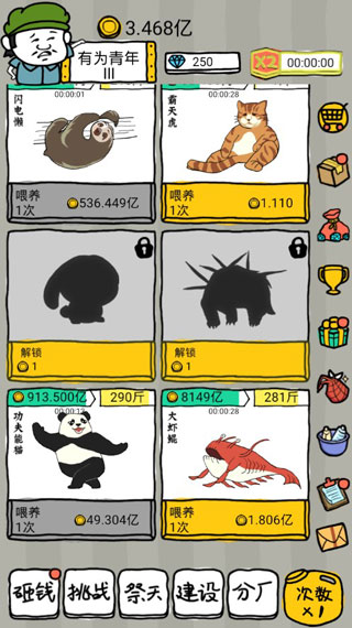 除了解锁、喂养宠物以外,砸钱、挑战、祭天、建设和分厂五大功能也是游戏的主要体现,其中: