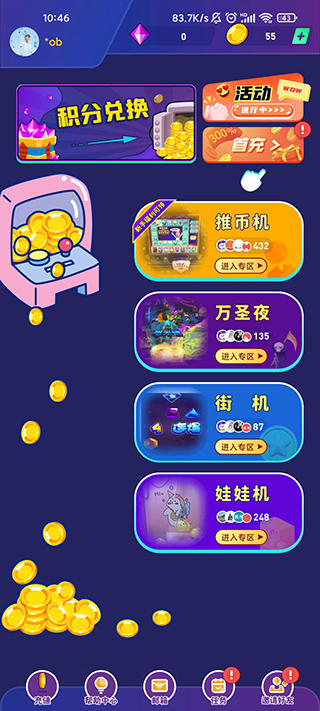 3、在主界面当中,玩家能够看到推币机、街机、抓娃娃机等多种玩法;