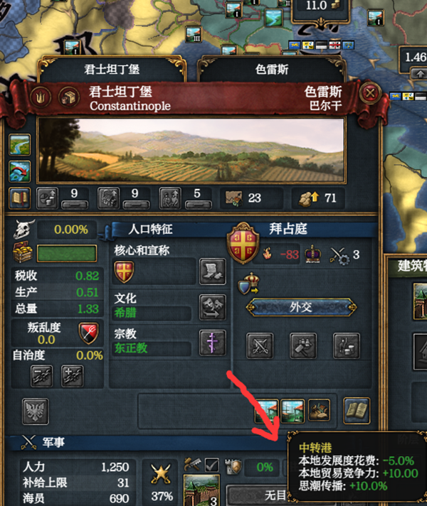 “君士坦丁堡”是奥斯曼的贸易本部,有三条支流汇入了“君士坦丁堡”节点,你在这放一个商人收钱,等于把水流拦腰截断,抽走了一部分,你能在一个节点能抽走多少水,取决于你在这里的“贸易竞争力”和这里的停留的总水量,所以到处乱抽是没有意义的,此处先假定你不改变开局自带的贸易本部。