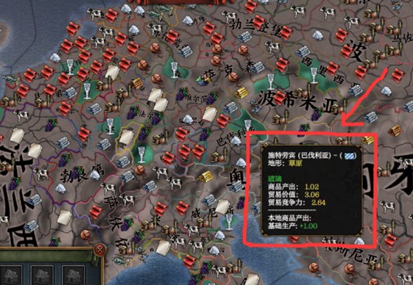 但是,比发展度更影响生产收入的其实是贸易品类型,即地区生产的“商品”,在游戏里有专门的一个地图可以显示,简单来说,商品价值越高,生产收入也越高,每提升一点发展度所带来的收入也越多。
