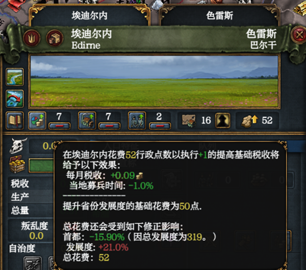 可以看到,发展度分为三种,分别对应三种点数,而与税收挂钩的是行政点数,所以税收收入是欧陆4里最固定、最不被重视的收入来源,因为行政点数基本都被用来建造核心,没有老玩家会拿来“种地”,可以说税收收入是你国家财政的一个“常数”,你不用去管它,它只会随着你疆域的扩大而缓慢增加。