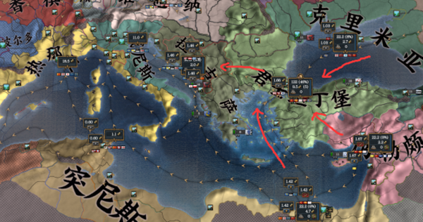 如下图,从贸易角度考虑,奥斯曼开局最该打的就是君士坦丁堡。