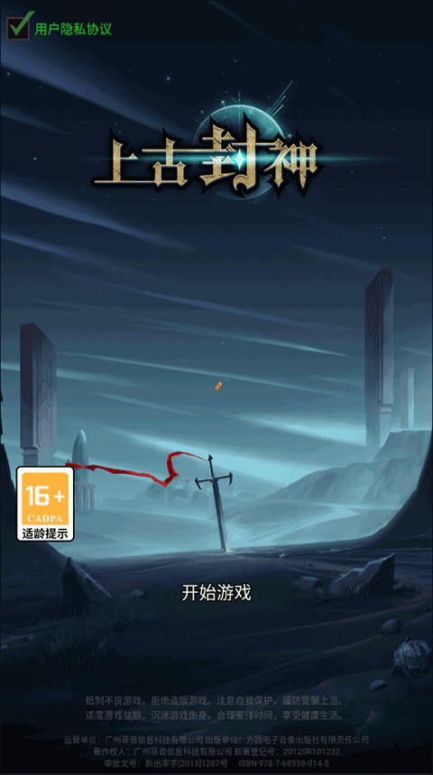 1、运行游戏后,点亮“用户隐私协议”后,找到并点击“开始游戏”选项;