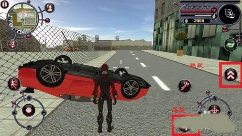 画面下角圆盘钮控制蜘蛛人物的走位和移向,上方的白人可实战疾跑,整个景道在上侧清晰指引。