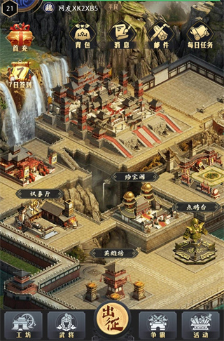 游戏以三国题材为背景,玩家可以通过争霸、出征模式,智慧排兵布阵、搭配养成武将、壮大势力阵营、独有的简略过程工坊系统等玩法,去开疆拓土,壮大自己的军队,实现自己的帝王梦想。游戏画面非常干净简洁,原景再现的主城布局,国风人物设计,清晰的功能指引给人舒适的游戏代入感。