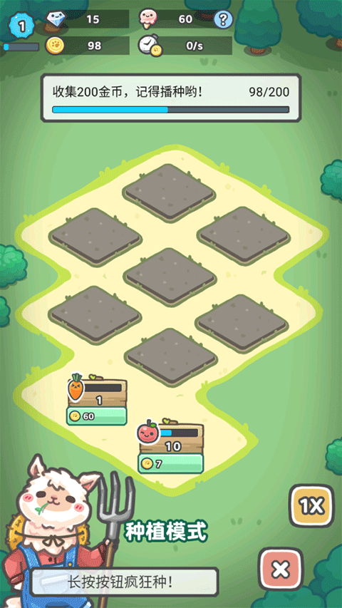 3、点击屏幕下方的铲子,就能切换到种植模式,长按按钮即可疯狂种!