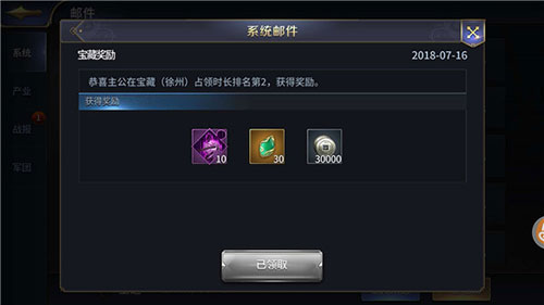 成功占领宝藏后开始计时,通过邮件对宝藏内占领累计时间最长的三个部队的玩家发放奖励。