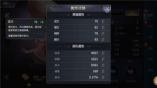 武力:提升武力,可提高攻击。部分技能受到武力加成效果。(佩戴宝物可提升武力)