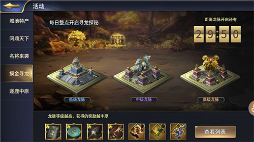 游戏中的战斗系统还原了古代战争模式,玩家需要排兵布阵,合理分配前军、中军和后军的位置,骑兵、步兵、弓兵和弩兵各有特点,战斗过程充满策略性。值得一提的是“摸金寻龙”玩法,宝藏争夺战考验玩家的决策力和团队协作,金色宝藏竞争激烈,但低战玩家也能通过跟随高手“抱大腿”参与。