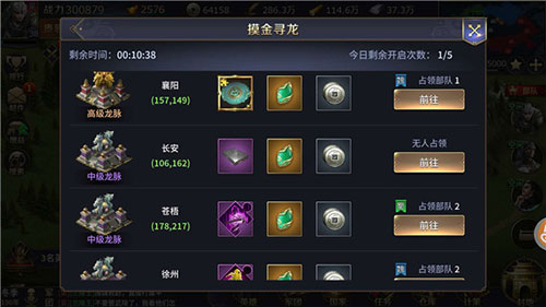 金色宝藏只会出现1个,抢夺非常激烈,基本就是高战专属,选择前一定要先看宝藏内部队战力情况,如果敌国占领,自己又打不过对方,尽快选择紫色或蓝色宝藏,不要白白损兵。