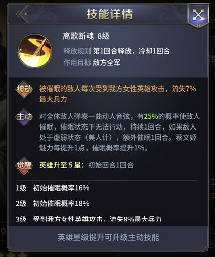 蔡文姬对全体敌人弹奏一曲动人音,有25%的概率使敌人催眠,催眠状态下无法行动,持续一回合,如果敌人处于虚弱状态(美人计),则额外催眠一回合,蔡文姬魅力每提升1点,催眠概率提升1%,英雄升至五星:初始释放回合提升至1回合。