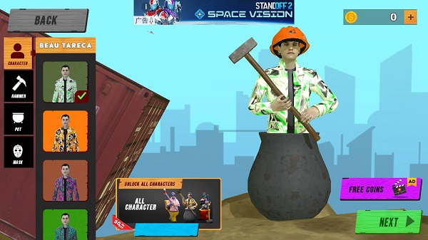 除了模式与Getting Over It有所不同,锤子男可选择的角色也有很多,每款皮肤的着装也都十分新潮,另外还有锤子工具、锅的皮肤以及安全帽皮肤等等,感兴趣的玩家一定不要错过哟~