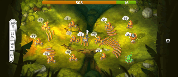 当首领拥有一定实力(人(菌)口)后,便可以调兵遣将向四周进行扩张。出征时,可以通过调节左侧的百分比进度条,选择不同建筑内想要派出的士兵数量比例(25%、50%、75、100%)
