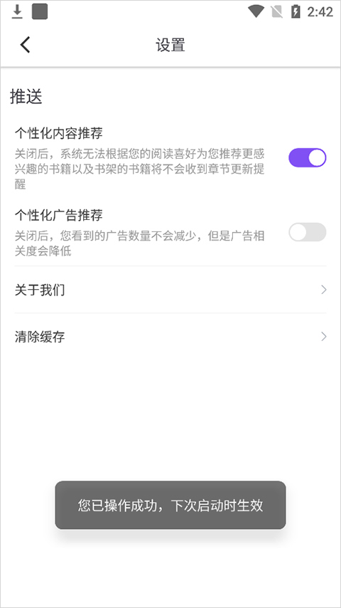 另外用户还可以前往应用的【我的】页面中点击【设置】,在打开的设置页面中关闭个性化广告推荐是可以减少广告推荐,让用户一次解锁开启纯净阅读模式后就可以在很长时间内不用看广告了。但需要注意的是关闭该项后需要重新启动应用方可生效