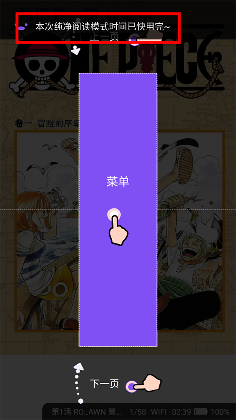 用户首次进入应用进行漫画或者小说浏览时,应用会提示用户本次纯净阅读模式时间已用完(下图红色方框区域内的文本信息)