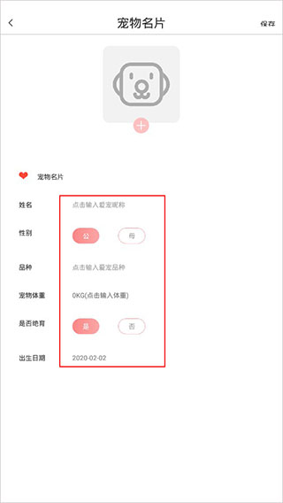 2、设置宠物名片,依次输入宠物的名称、性别、品种、体重、是否绝育和出生日期;