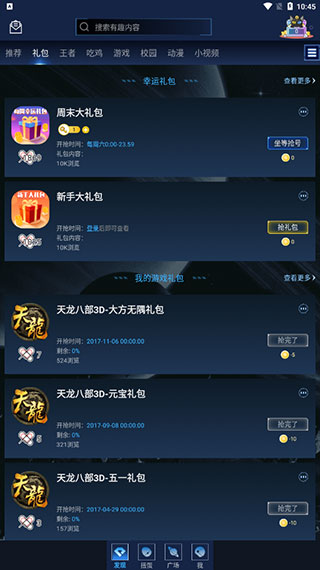 4、而在主界面不仅可以搜寻自己想要的内容,还能抢软件发布的游戏礼包