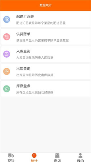 2、就能看到配送、统计、商店、我的四个板块,在统计中能够看到入库查询、供货账单、配送汇总表、出库查询、库存盘点等数据:
