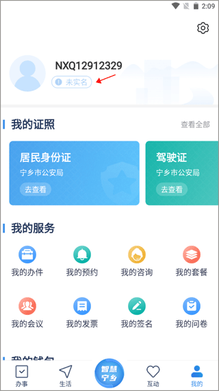 1、进入智慧宁乡APP进入个人中心页面,点击“未实名”。