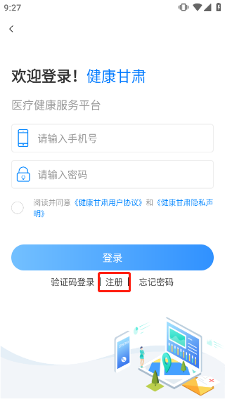 2、进入健康甘肃登录页面,点击下方的“注册”,开始进行注册流程。