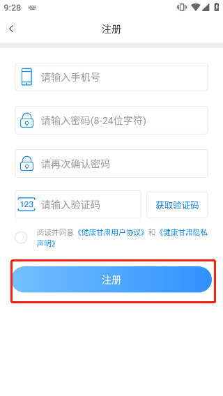 1、在本站下载健康甘肃并注册认证,点击“马上注册”进入注册页面;