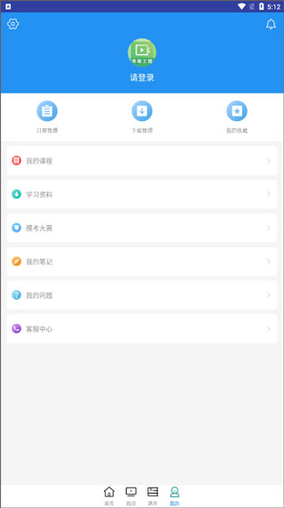 1、在本站下载安装,并且运行软件,然后会看到首页、视频、题库、我的四个板块,首先点开我的,有着订单管理、下载管理、我的收藏、学习资料、我的课程、模考大赛等各种功能:
