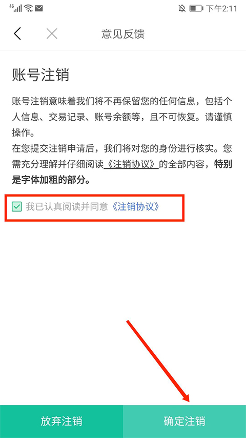 4、勾选“我已认真阅读并同意注销协议”后,选择右下角“确定注销”,即可注销账号。