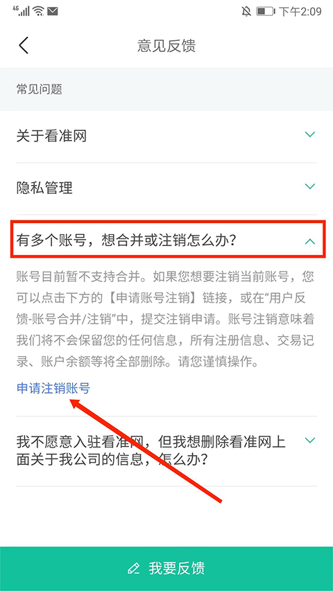 3、进入意见反馈界面,选择“有多个账号,想合并或注销怎么办”选项,点击“申请注销账号”,