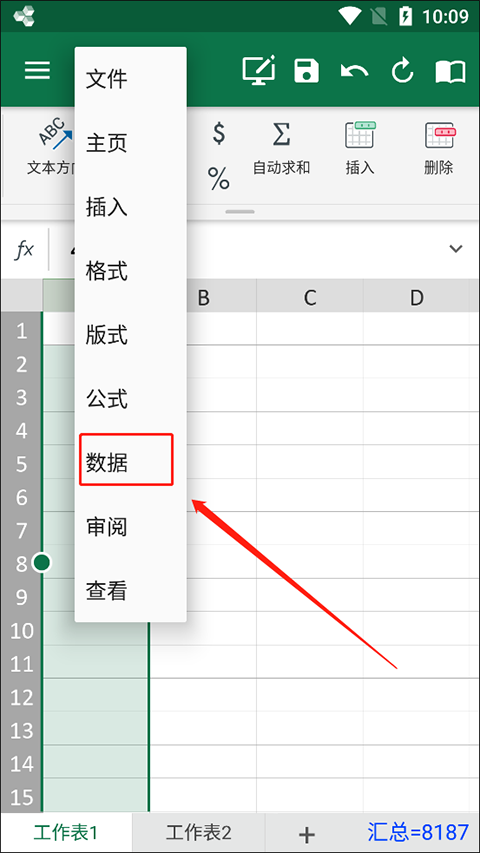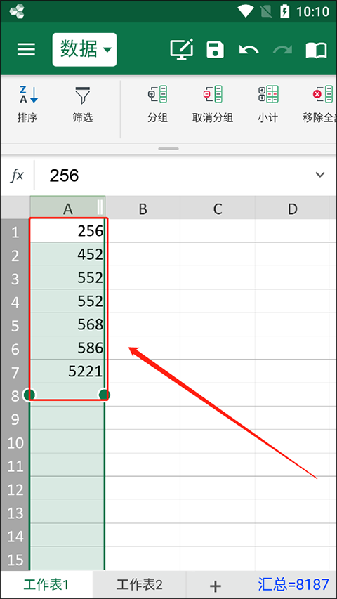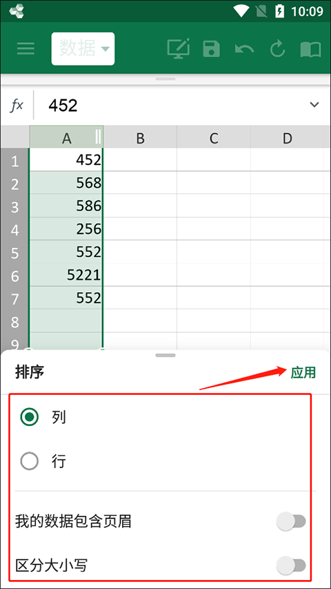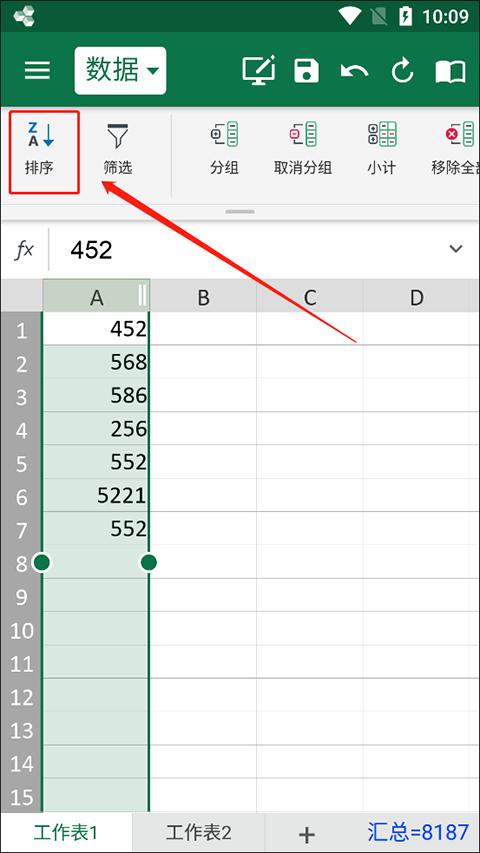 4、在单元格添加一列数字并选中,再点击APP界面上的"排序"菜单(小编比较懒,所以就简单的随便输入几个数字了哈)。