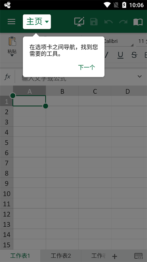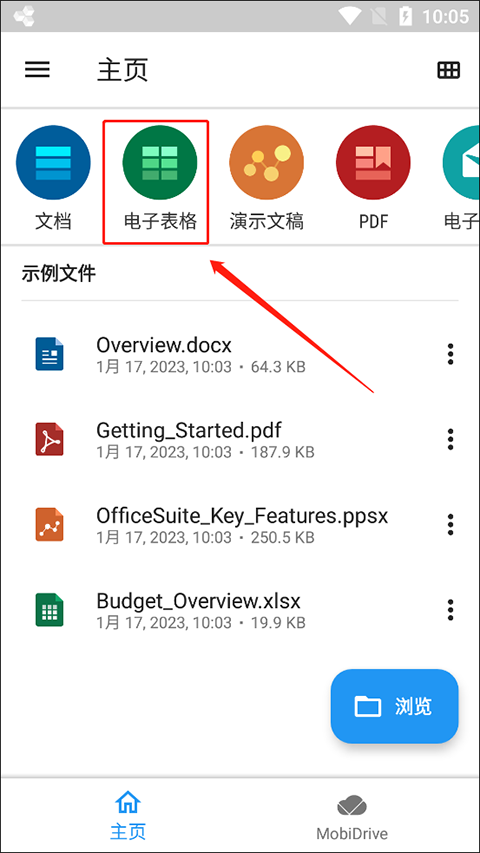 1、首先在手机上打开该软件,选择"主页"->"电子表格"菜单。