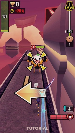 相较于很多跑酷游戏将重点放在“跑”的元素上,《战斗少女跑酷》从游戏标题就已经反映出,“战斗”才是这款游戏的核心。在面对中途出现的小丑时,我们没有闪躲的余地,即便和敌人不在同一个轨道上依然会受到攻击。所以主动出击是唯一的选择,抓准时机朝敌人的方向滑动屏幕即可,如果处于同一轨道上那么只需要向上滑动,用手中的武器将敌人“一刀两断”吧!这种主动出击的设计,在考验反应力的紧张感之上,增添了不少爽快感。尤其是当敌人密集出现的时候,左右挥舞手中武器的感觉,特别带感。不过一般情况下,游戏的速度感并不是非常强,如果你对自己的技术充满信心,并想来点更有挑战性的玩法,那么可以手动进行加速——只要不断的向下滑动屏幕,就可以不断的加速再加速,超越极限享受极致快感。