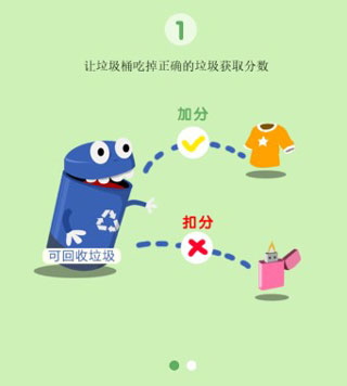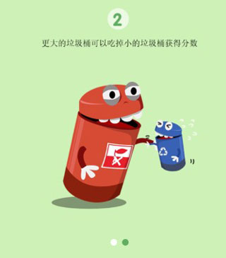 游戏玩法:以清理周边的垃圾来获得积分为目标,根据自主分配的四大阵营来获取相应的垃圾,成功选择+6分,否则扣3分,切记也不要被其他大的垃圾桶欺负。