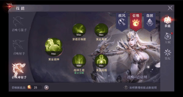 在1转进为射手后,选择召唤后,获得精髓技能,致命精通,大幅度提升角色致命一击概率,所有黄金射手享有加成且效果翻倍。多重召唤箭和五重召唤箭持续高爆发输出的同时会概率额率召唤一个黄金斗士。召唤提高可以把自身和队友的基础攻击大幅提高。