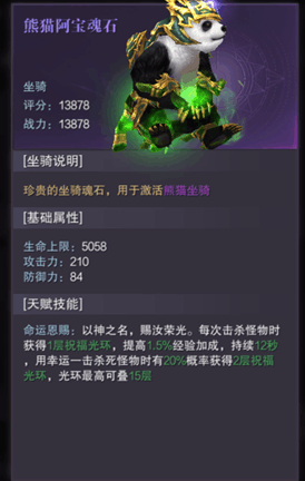 在【坐骑】系统中玩家可以激活外形各异的神兽作为自己的坐骑,每种坐骑不仅包含强大的基础属性还有独特的天赋技能,例如:熊猫阿宝的【命运恩赐】提高击杀怪物经验,人人必备。