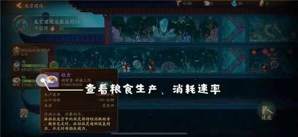 3、建设技巧:把3个花鱼田连着建设,合并在一起可以升级,最高2级。可以点击画面左侧“粮食”,查看目前粮食生产速率、人口消耗速率,如果发现消耗>产出,则需要加强花鱼田的建设。