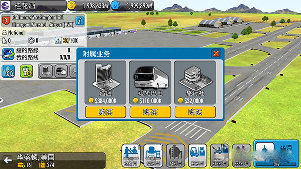 在经过前期的稳定发展之后,公司的业务也逐渐稳定,这时候可以考虑利用其他附属业务来赚钱,购买机场是个不错的选择但是价格很贵,酒店、观光大巴、旅行社都可以进行购买。