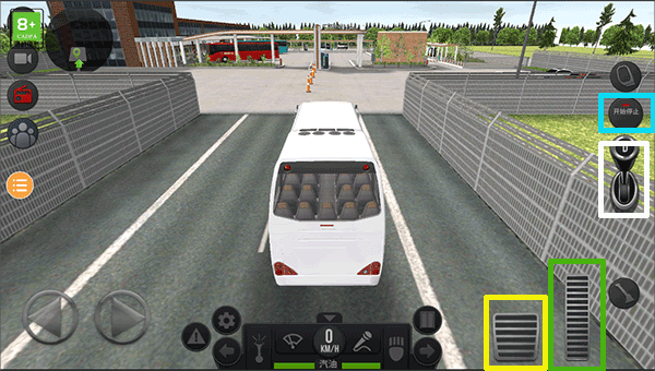 3、正式开始游戏,篮色方框内的按钮是开启车辆的运行,绿色方框内的按钮是油门,黄色方框内的按钮是刹车,白色方框内的按钮是控制车辆前进or倒退;