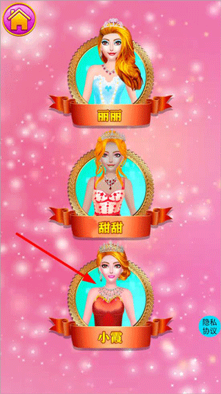 1、打开魔法公主美妆学院游戏,点击首页开始,进入游戏后,选择喜欢的公主为她装扮;