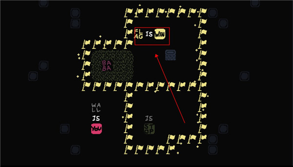 4、更改一下过关条件,让它变成“rock is win”,你便可以不再理会那个旗子。直接触碰石头即可过关。