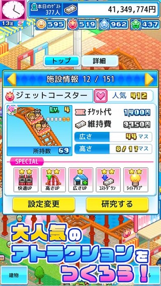游乐设备和区域能通过研究提高人气以及门票价格,另外,在研究中具有以一定概率能获得提高乘坐舒适度、延长闭园时间或者降低维护费等特别的功能,不过也有可能失败。