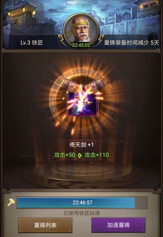 【重铸紫装 分分钟突破极限】炉火纯青时,壮士铸剑日!《正统三国》装备重铸玩法设置一定门槛,当主公达到指定等级,即可如愿开启。在铁匠铺的重铸系统中,主公可通过消耗银币、木材、相同装备、重铸石对紫色装备进行重铸,从而大幅度提升属性,一件紫装最多可重铸10次,每次重铸都能提升加成幅度,正所谓重铸一时爽,一直重铸一直爽,最适合追求极致的主公们体验!此外,虽说心急吃不了热豆腐,但是雇用重铸系统的老铁匠,其精湛手艺、丰富经验,可带来重铸加速效果,以偿你手握神兵利器即刻出征的夙愿!