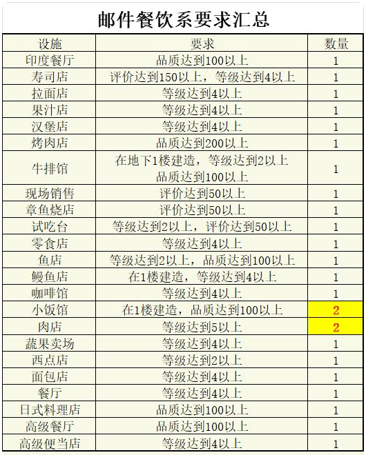 初期所有拥有的建筑物后续都是有顾客需求的,然后挨个用点数进行等级提升,升级后会少量提升商品价格和评价,暂时可以提升至2级,因为2级是之后邮件系统大多数顾客成为常客的要求条件,顾客后续成为常客后会赠送店铺或者是引进新顾客。升级之后的点数餐饮类尽量点库存,这个时候的引进服务优先点餐饮的。因为餐饮的有店员加成品质相对好卖,其他系列根据个人需要点,但是绝大多数的情况下点库存,除了极少数有任务需求的会点品质(比如服务台)。