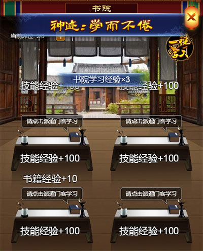 书院初始会自动开启一个学习位置提供给老爷,老爷可以派遣当前未被流放的门客前往书院进行学习哦!学习成功后门客会获得书籍经验还有技能经验哦!