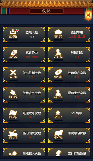 成就任务包括:登录天数、官品等级、累计势力、解锁门客、关卡胜利次数、经营商产次数、经营农场次数、招募士兵次数、处理政务次数等。