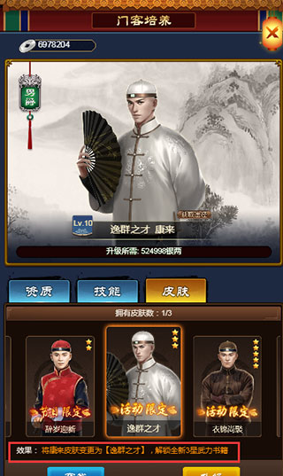 门客皮肤的来源活动,皮肤穿戴后会给门客解锁新的资质技能,从而提升门客的资质属性,给各位老爷的门客如虎添翼